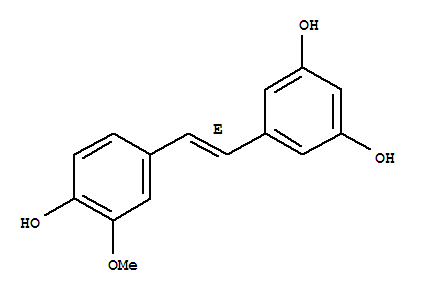 - 中文別名:5-[(1E)-2-(4-羥基-3-甲氧基苯基)乙烯基]-1,3-苯二酚;(E)-3'-甲氧基-3,4',5-三羥基苯乙烯;(E)-5-[2-(4-羥基-3-甲氧基苯基)乙烯基]-1,3-苯二酚;